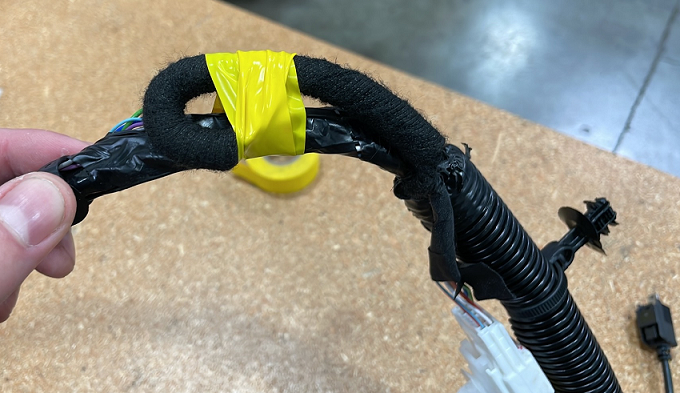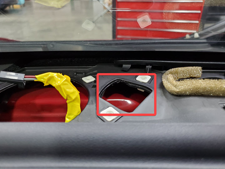 警告切勿为了改装高频扬声器而在新仪表板支架上切孔。警告未能粘回现有的高频扬声器连接器可能导致 NVH 问题。注使用黑色胶带。图片中的黄色胶带仅作展示用。