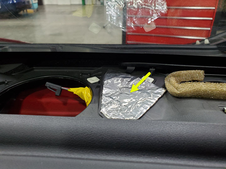 注剪一条丁基橡胶带,将孔遮住。确保丁基橡胶带未覆盖仪表板卡子或接触到扬声器外围。