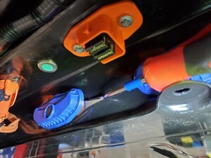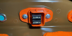 注2x bolts, 10mm, 5 Nm, Pivot forward edge down past frunk assembly, then carefully move rear edge past brake reservoir and into position