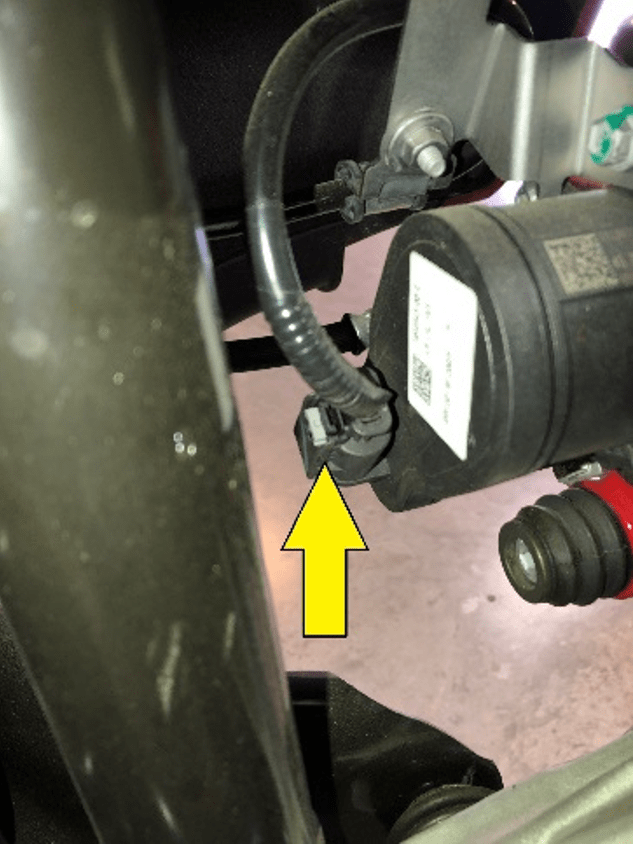 - 松开红色固定锁片,断开电气线束与左后制动钳连接器的连接。
