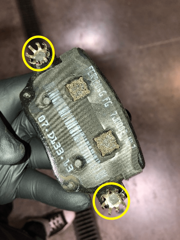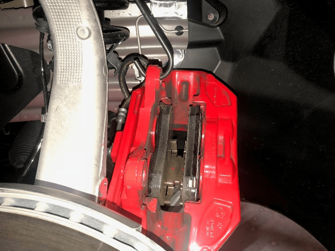 使用刷子和 Tesla 批准的制动器清洁剂清洁相接平面、活塞表面、左前制动钳内表面、定位销、减振弹簧、制动片边缘以及与制动钳接触的表面。