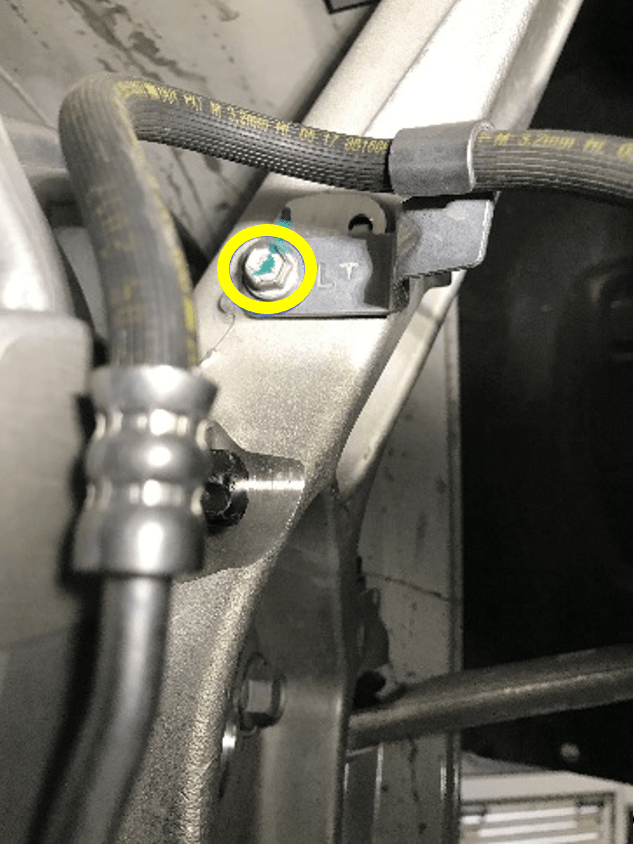 - 拆卸将震动软管支架固定到左前转向节的螺栓,然后将支架从转向节上拆下。
