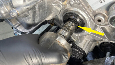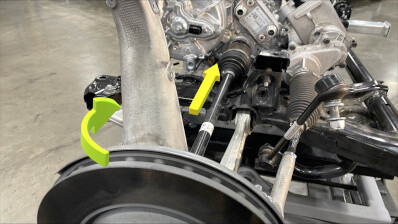 将左侧转向节向内折叠并继续将左前半轴安装到前驱动单元中,直到半轴完全接合到差速器内的弹性挡圈上并发出“咔嗒”声。
