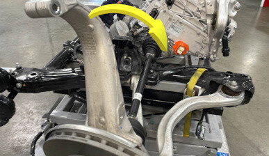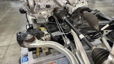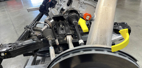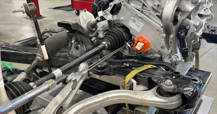 在协助下,使用起重机架降低驱动单元吊索工具,将半轴引出新的前驱动单元,并将新的前驱动单元降到前副车架中。