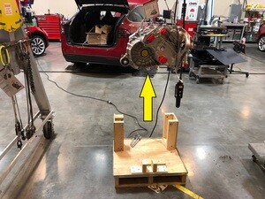 - 使用起重机架升起驱动单元吊索工具,然后将前驱动单元板条箱移动到旧的前驱动单元下方。