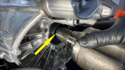 将右侧转向节向内折叠并继续将右前半轴安装到前驱动单元中,直到半轴完全接合到差速器内的弹性挡圈上并发出“咔嗒”声。