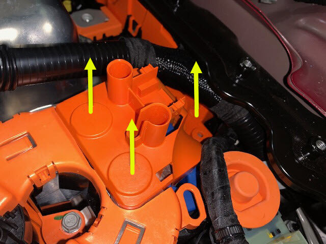 - 将高压电池负极触点开关线束移到侧面,然后径直提起高压电池探查导件,将其从高压电池仓上拆下。