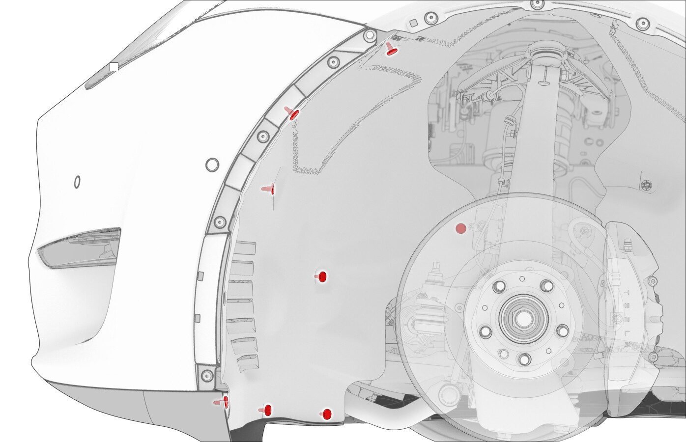 - 释放将前轮拱内衬前部连接到车辆的夹子 (x8),将内衬小心拉出前饰板,然后放置一旁。