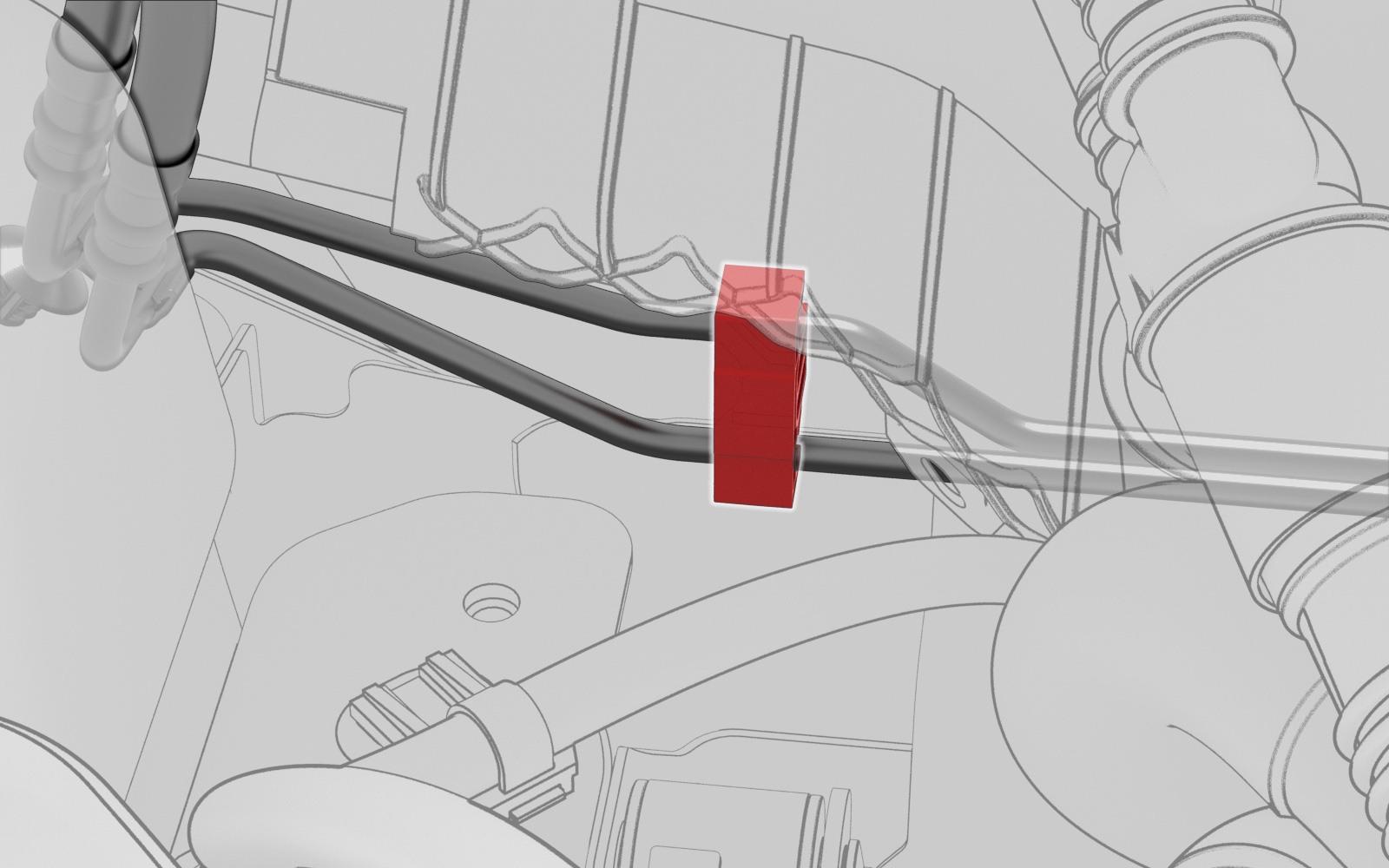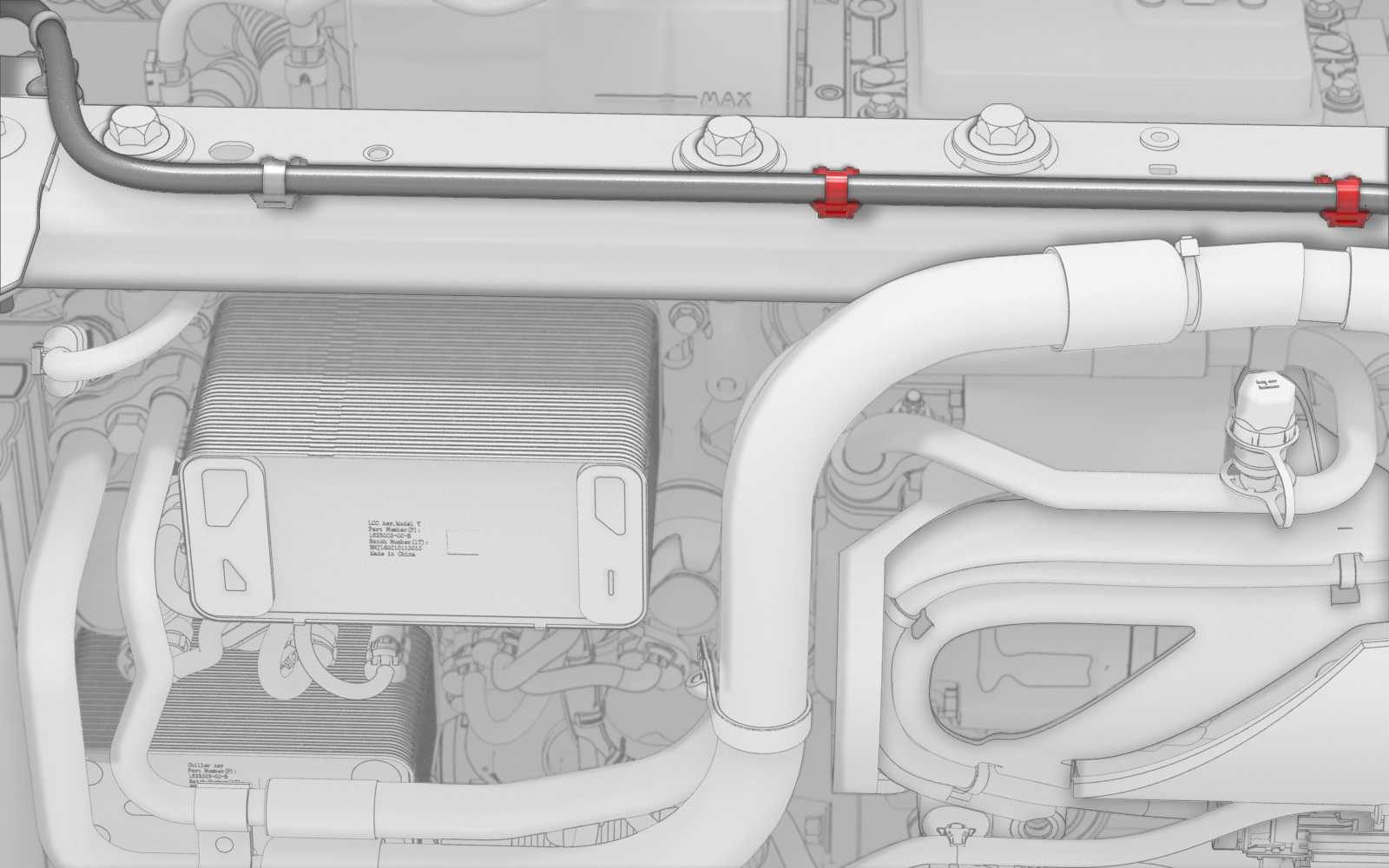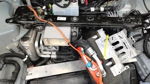- Remove the retaining clips (x2) that attach the AC compressor HV harness to the shock tower brace.