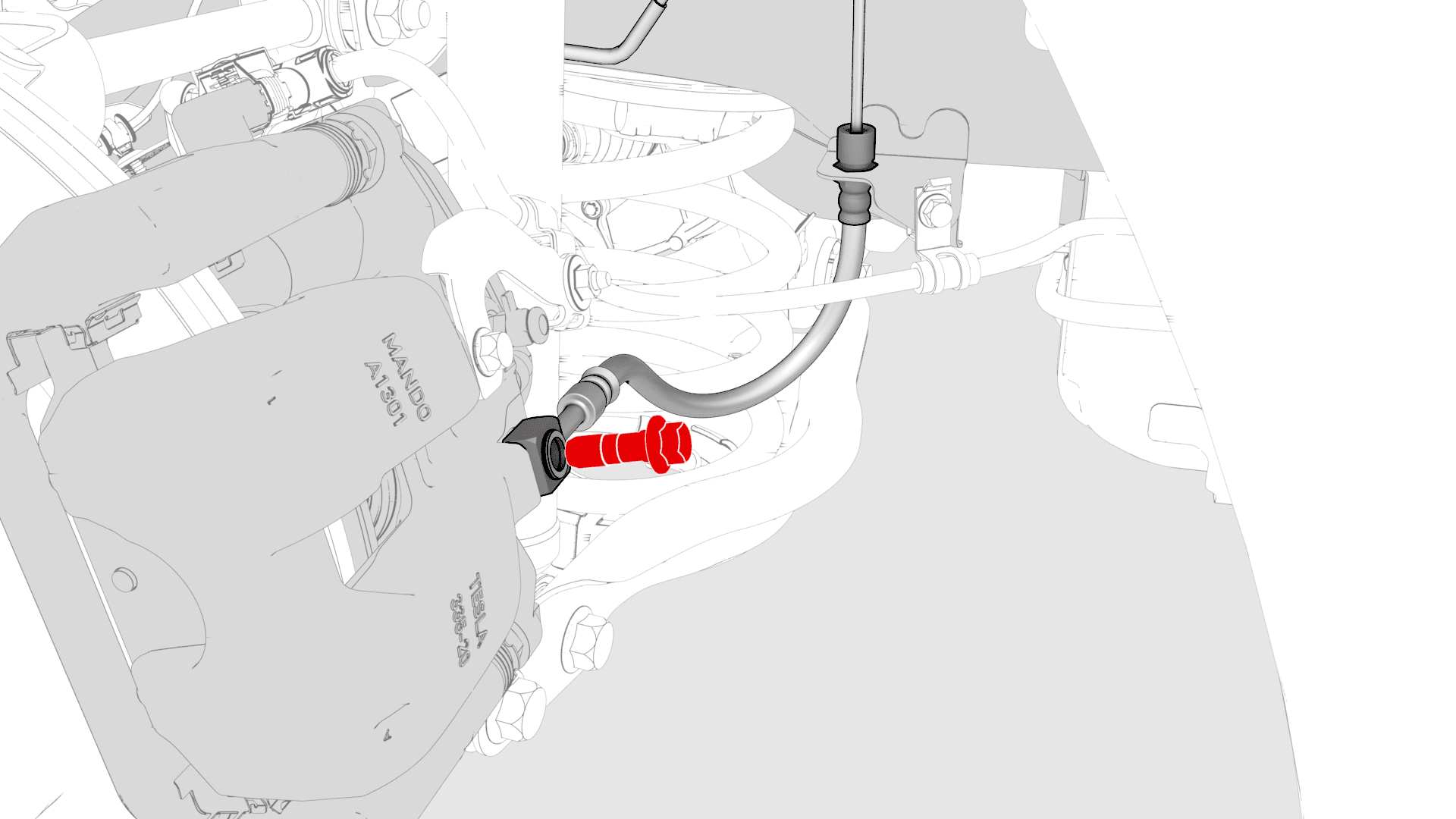 将制动管路插入震动软管支架上的制动软管中,然后使用爪形加长件将制动管路管束螺母安装到制动软管上。
