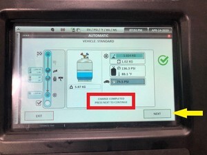 重新加注制冷剂 1.02 千克(1020 克);对于 Robinair 空调机,按下 ESC 键,点击 “NOT ACCEPT”,不接受清理残留机油的步骤;完成后,按下 “next” 开始“加注结束”流程