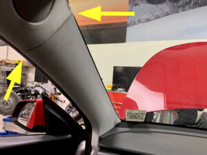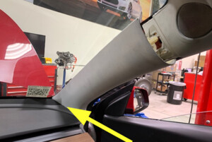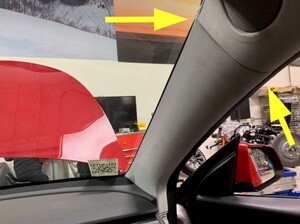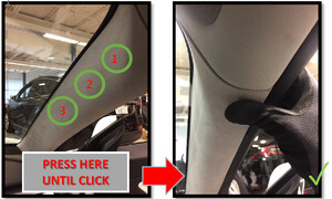 1 个卡子,1 个锁片;对齐底部锁片,然后推动顶部卡子,使其完全就位于 A 柱中部;将密封件拉过饰板