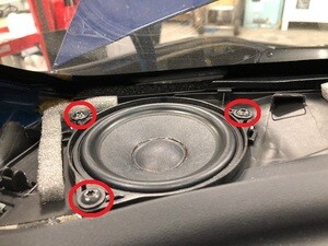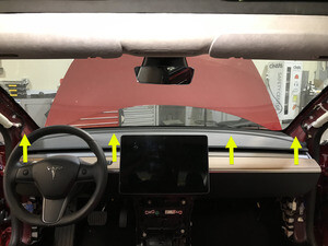 3 个夹子,1 个系带;沿仪表板和扬声器格栅滑动饰板底部,将系带固定到车身侧;从底部开始向上放置夹子;将密封件拉过饰板