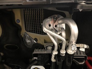 1 个螺栓,10 毫米,4 Nm,2 个卡子;1 个销;拆下螺栓;将销从温度系统横梁上小心撬下,然后从隔板螺柱上拆下