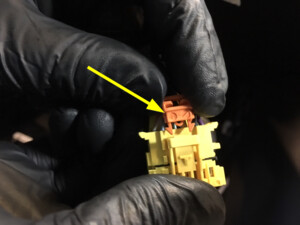 1 个连接器;拆下连接器上的固定卡子,松开连接器,然后从连接器上拆下另一个已损坏的卡子;拆下固定卡子后弃用;原装固定卡子为黑色,更换用固定卡子为橙色