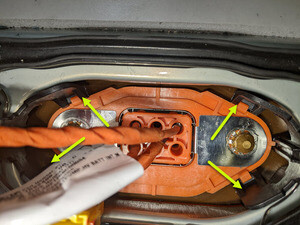 注2x HV joints, The acceptable resistance is between 0.050 mΩ (50 μΩ) and 0.195 mΩ (195 μΩ).If the resistance is greater than 0.195 mΩ (195 μΩ), there is too much resistance in the High Voltage joint. Remove the fastener, clean areas with isopropyl alcohol, install fastener back and test again.If the resistance is lower than 0.050 mΩ (50 μΩ), reposition the probes and measure again.If the resistance is repeatedly between 0.00 mΩ and 0.050 mΩ (50 μΩ), hioki test passed, proceed to next step