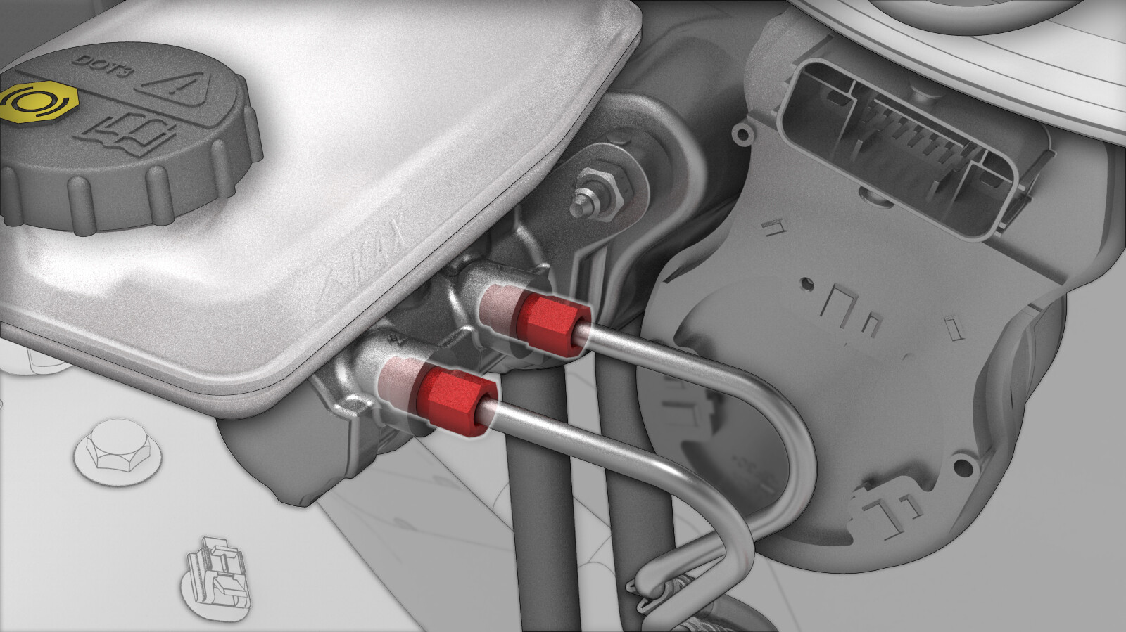 断开制动管路 (x2) 与主缸的连接。