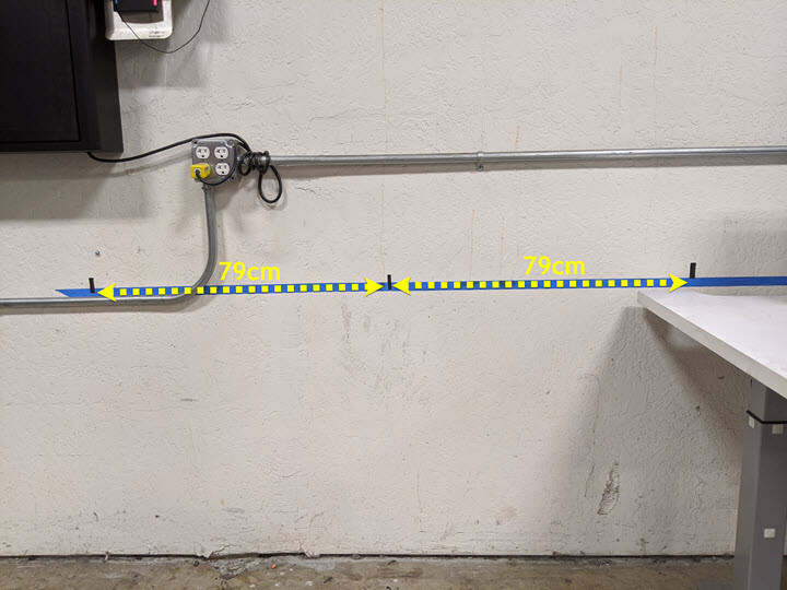 - 在距离中心参考点左右两侧79 厘米(31.1 英寸)处的墙壁上粘贴胶带。这两处为左右两侧的参考点。