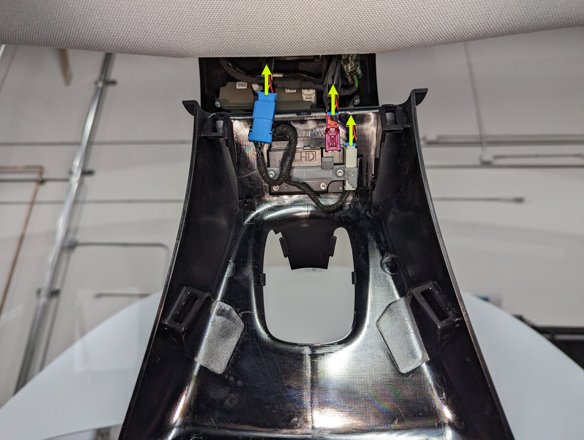 注确保后视镜连接器穿过将四摄像头上盖的开口处。