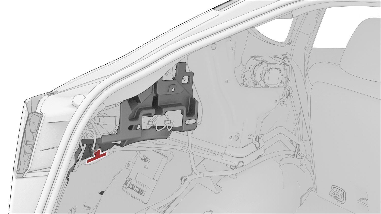 - 将 LH C 柱支架安装在车辆上,然后将充电端口手动释放管安装到支架上。