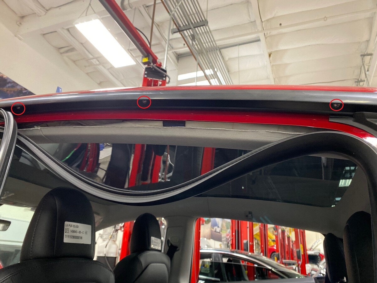 - 拆下将 LH 顶部亮条的后部固定到车身的螺钉 (x3)。