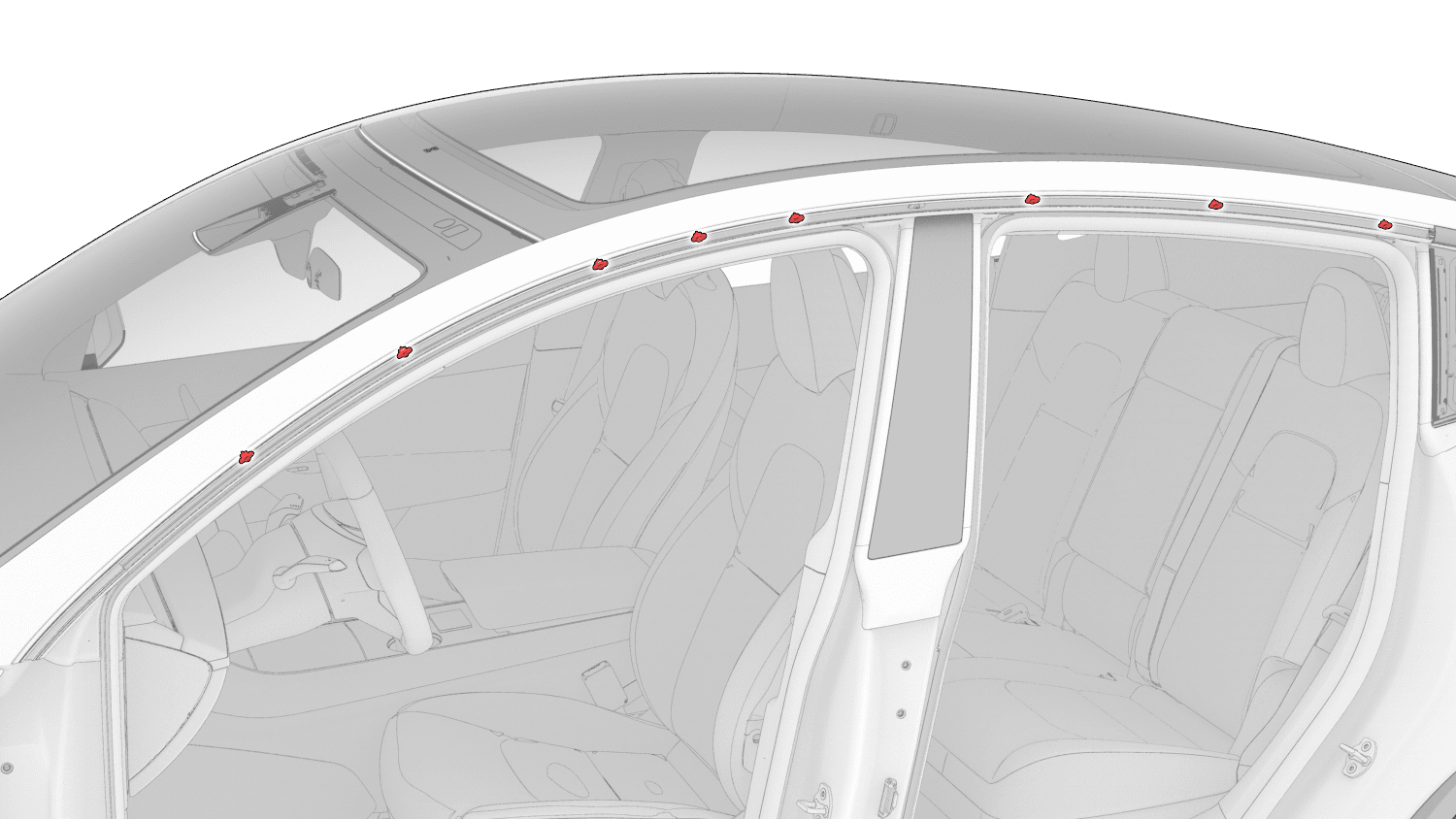 - 在即将安装 LH 顶部亮条的车身位置上安装新索环 (x8)。