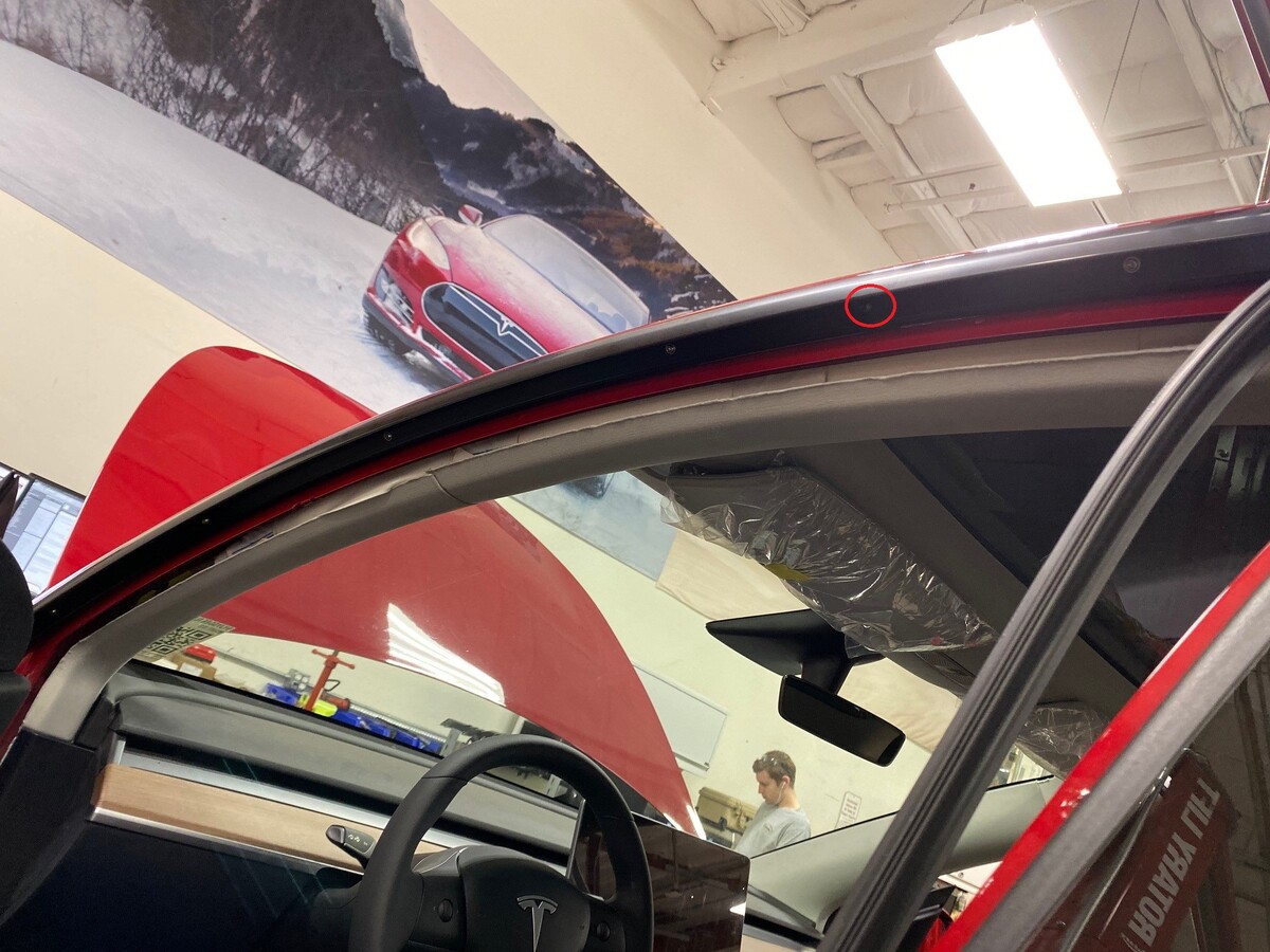 注从后角窗玻璃开始安装,确保亮条在从后角窗玻璃上伸出的定位销上完全就位。