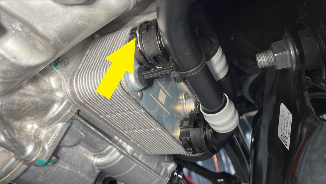 - Remove the plugs from the fittings, immediately connect the rear drive unit outlet hose to the rear drive unit heat exchanger, fasten the clip, and then perform a Push-Pull-Push check of the fitting.