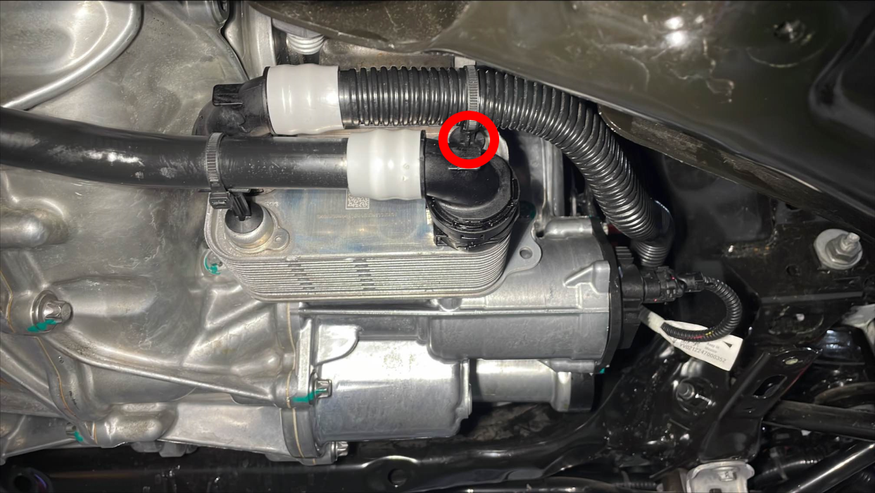 - Fasten the clip that attaches the rear drive unit outlet hose to the rear drive unit heat exchanger.