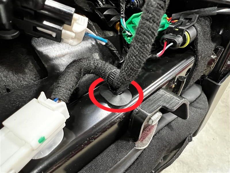 - 连接第二排座椅线束连接器,然后紧固将座椅线束固定到座椅框架底部的夹子(2 个)和弹性线束固定器。