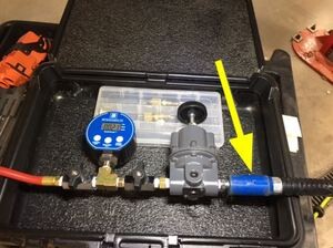 - 将外壳泄漏测试适配器安装到高压电池仓探针盖上,然后将其连接到调节器测试工具