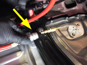 - 断开泄漏测试适配器与调节器测试工具的连接,然后将其从高压电池仓探针盖上拆下