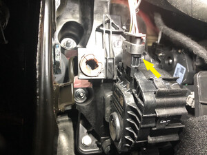 注Confirm that the brake pedal is in the home position, iBooster and Brake Pedal must be assembled together for brake light switch to be installed, Push the brake switch into the clip until it stops (don't push so hard as to move the brake pedal), Twist clockwise 45 degrees to set the brake switch, Make sure brake switch connector facing RH side of vehicle with connector pins vertical
