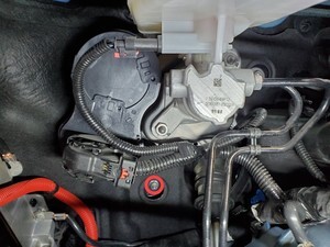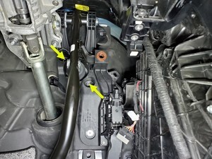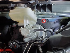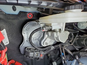 注2x bolts, 10mm, 5 Nm, Pivot forward edge down past frunk assembly, then carefully move rear edge past brake reservoir and into position