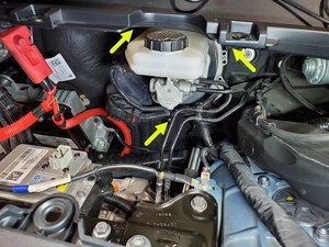 注2x bolts, 10mm, 5 Nm, Pivot rearward edge up and past brake reservoir, then lift up to clear frunk assembly