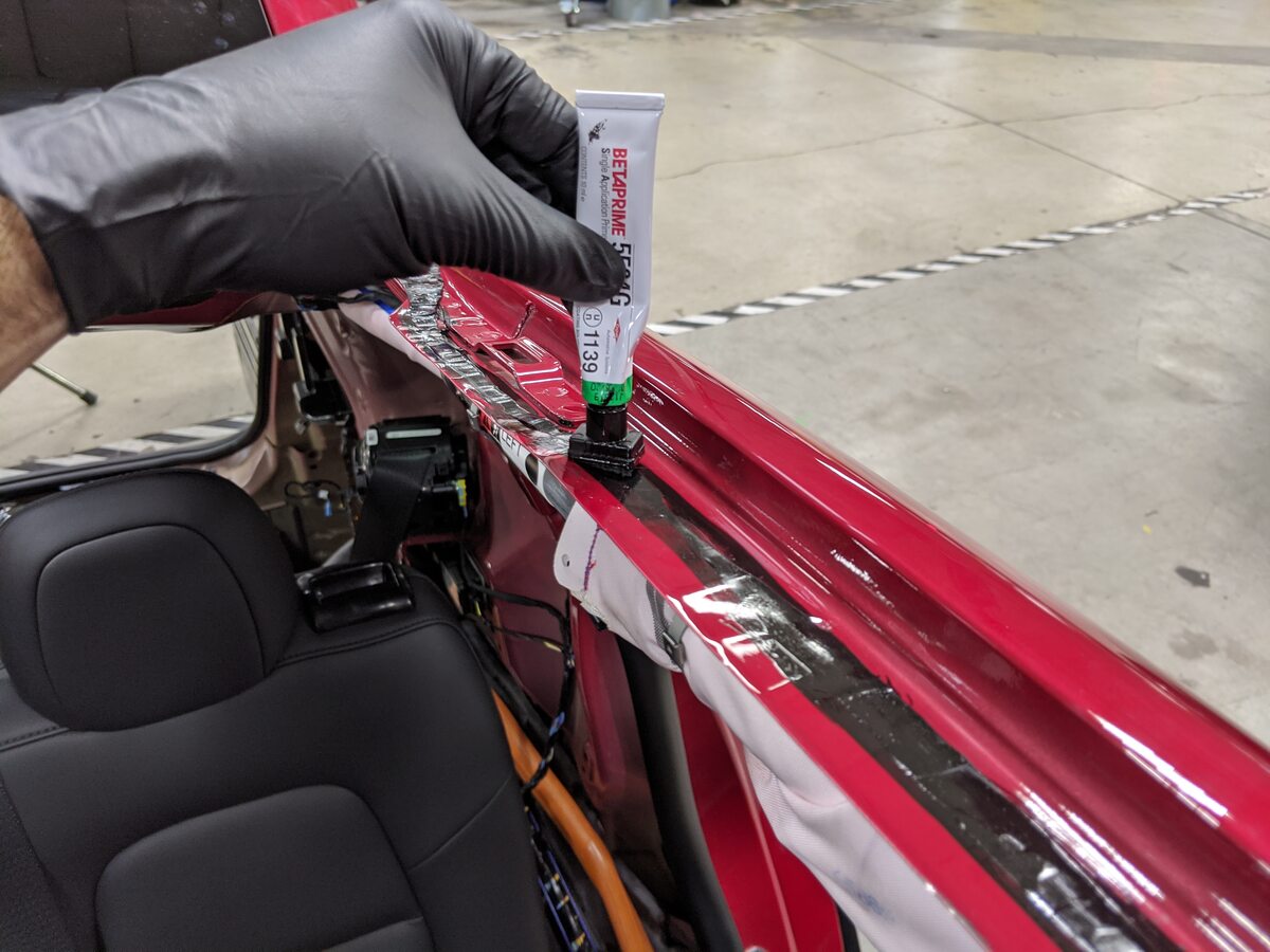 沿着聚氨酯路径,在车身上以及拆卸固定车顶玻璃期间损坏的区域涂抹聚氨酯底漆。