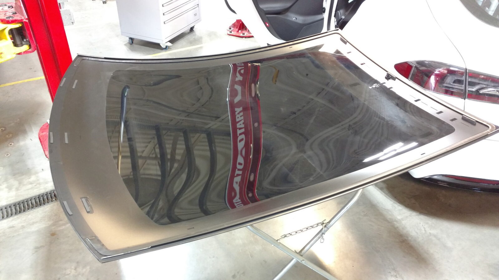 - 在协助下,拆下车顶玻璃并将其倒放在工作支架上。