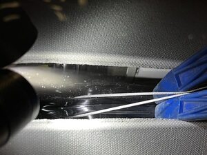 将线固定在穿线器上,然后将穿线器推进车顶固定玻璃总成左后角的聚氨酯。
