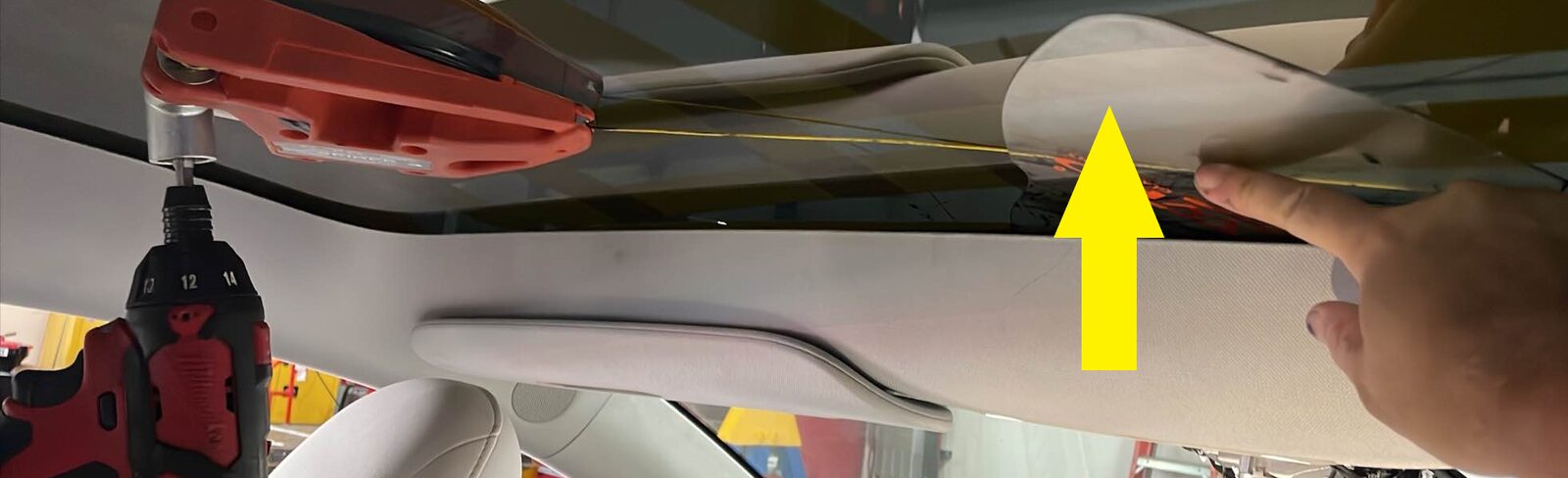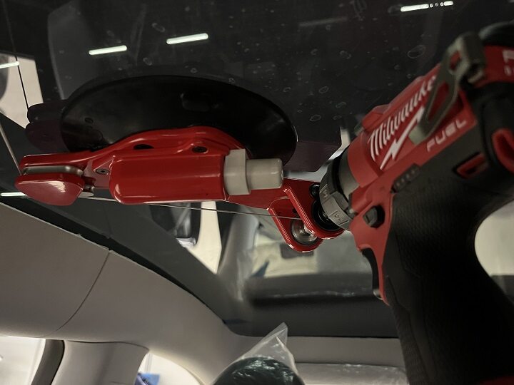 使用电钻切开玻璃周围的聚氨酯。切割时,随着尼龙绳移动顶篷保护装置。