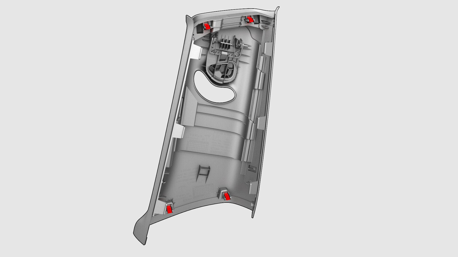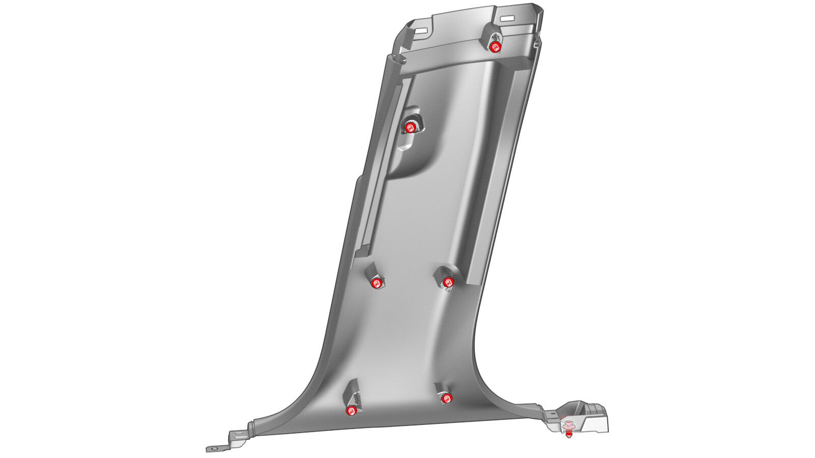 - 将 B 柱 LH 下部饰板底部导片与卡槽对齐,然后向上逐个锁紧剩余夹子。