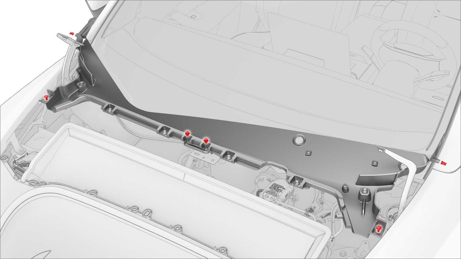 - 松开将前围篦板固定到车辆的夹子,然后从车上拆下前围篦板。