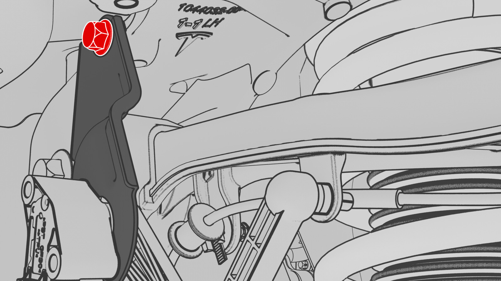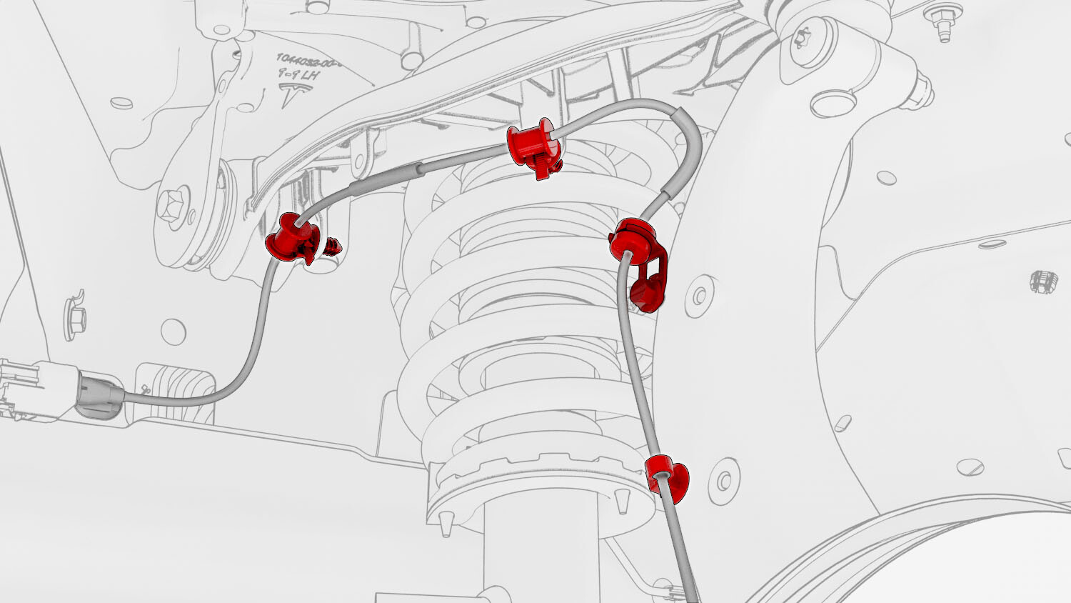 - 安装将左前轮毂转速传感器线束固定到转向节和前上方控制臂的夹子。