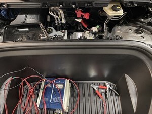 注Release positive terminal cover, Secure positive terminal to jump post, Secure negative terminal to bolt located between brake fluid reservoir and front trunk, Connect maintainer to power supply, To avoid damaging the vehicle DO NOT allow positive cable to make contact with other metal components, Never have a float charger and the LV battery simultaneously connected for any extended period of time
