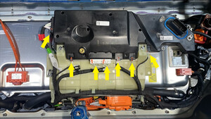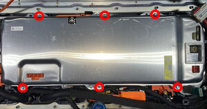 Release perimeter bolts securing ancillary bay to HV battery