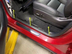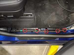 - Install the RH front seat harness to the lower A-pillar 12V bracket clips (x5).