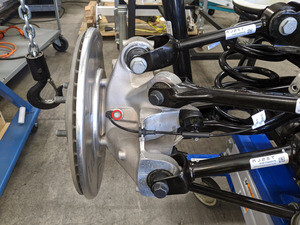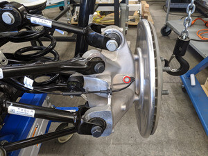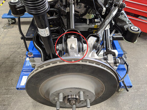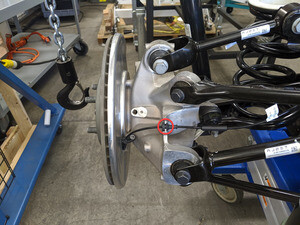将左后制动钳从左后转向节上拆下,然后将其悬挂在车身上