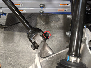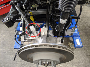作为辅助检查,测量围板底部到轴中心的距离,以确保左悬架已设置到行驶高度