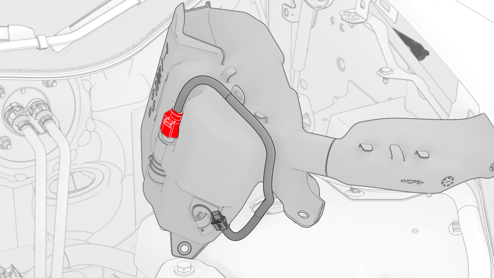 - 将电气线束连接到挡风玻璃清洗器泵连接器和液位传感器连接器上。