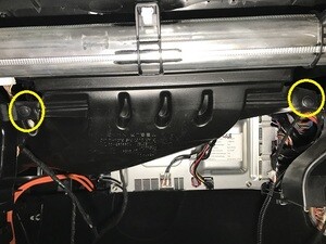 注2 个螺钉,T20,2 Nm,1 个推拉式夹,4 个耐落螺栓,E10,8 Nm;拆下后弃用推拉式夹;降下时需支撑膝部气囊;连接器/线束长度非常短