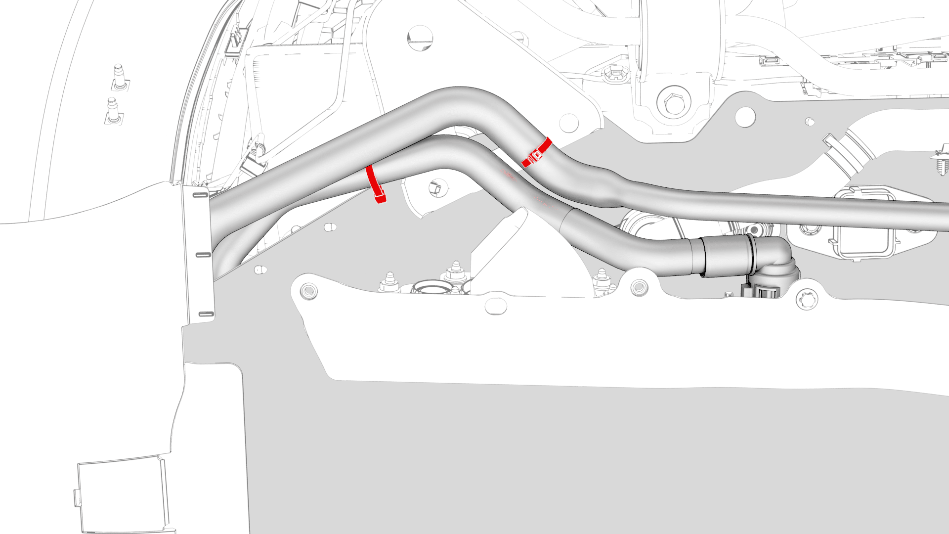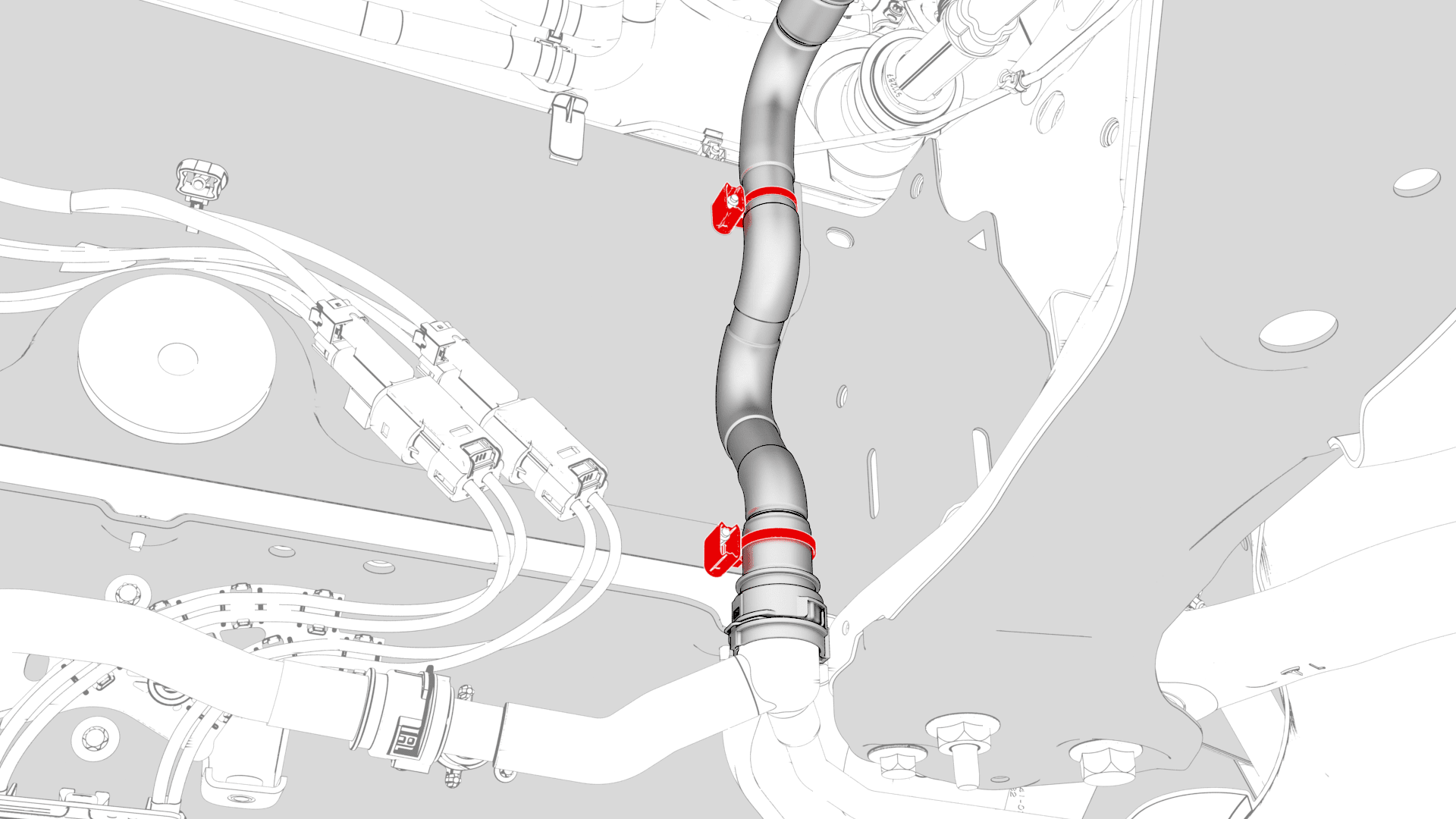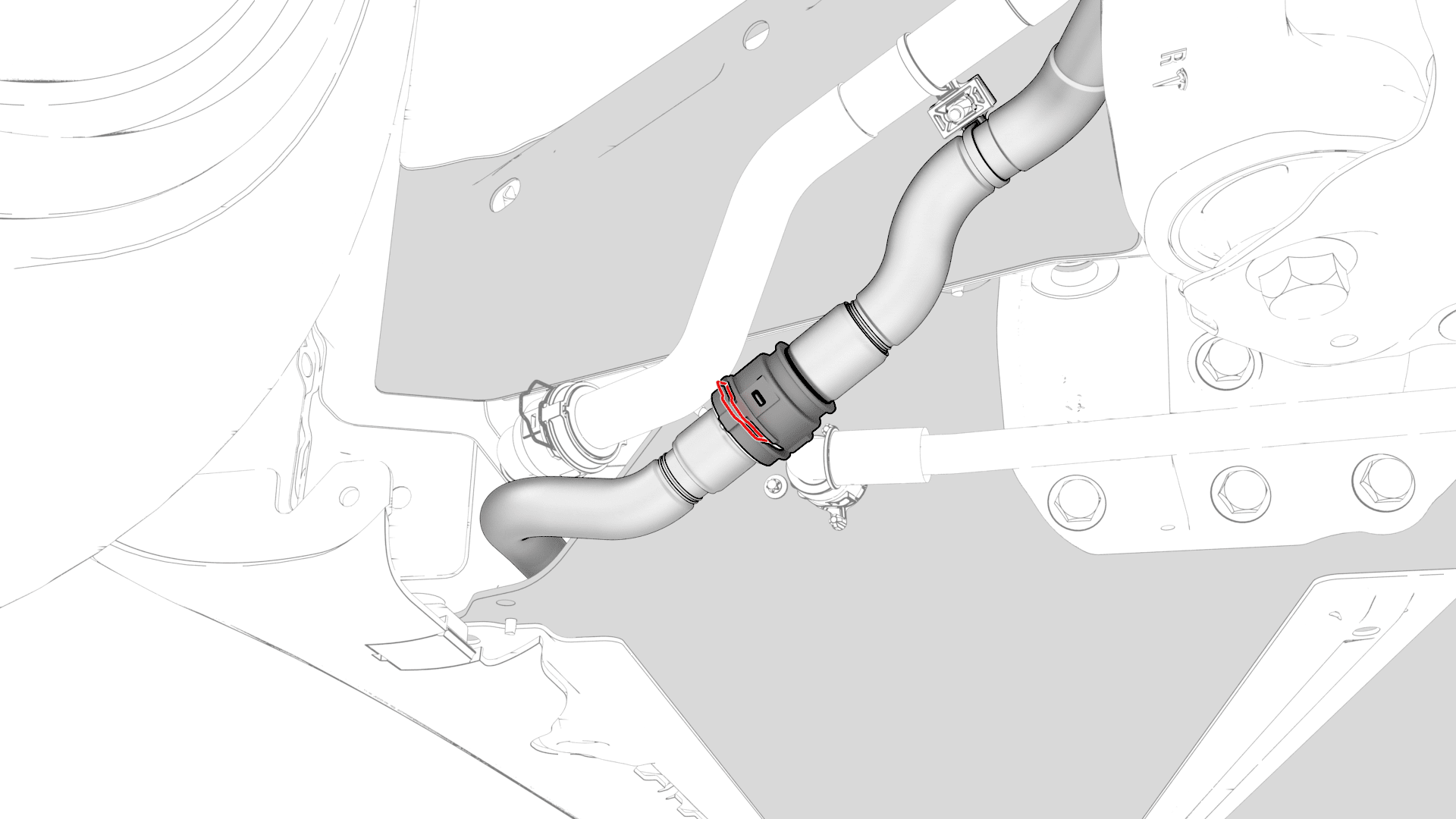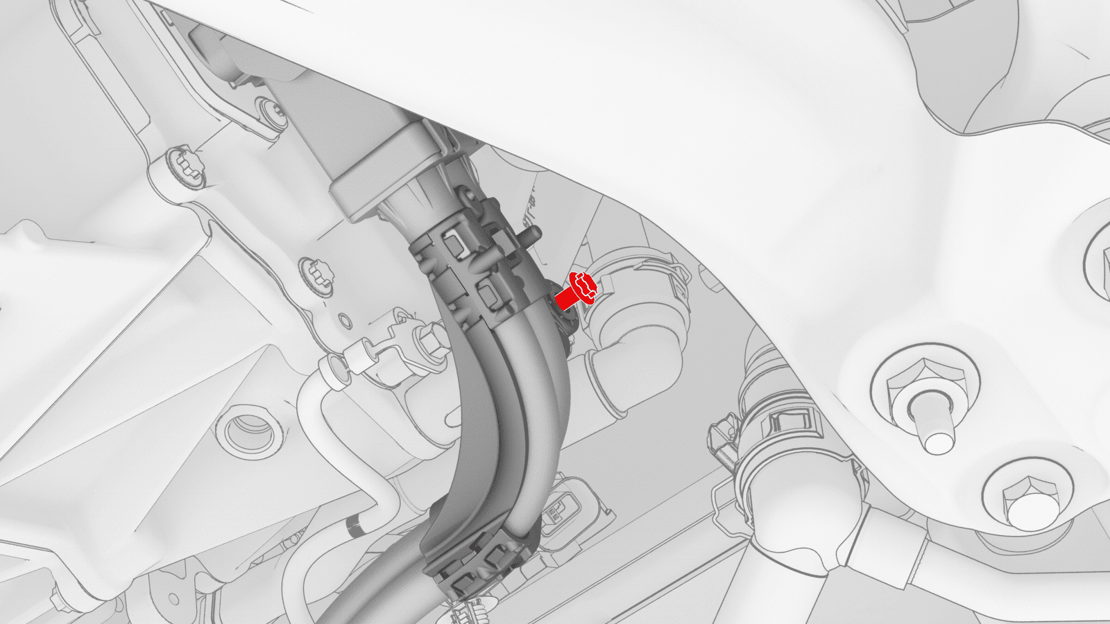 取下车辆右侧动力总成回流软管上的塞子,立即连接外螺纹接头和内螺纹接头,然后紧固卡子。